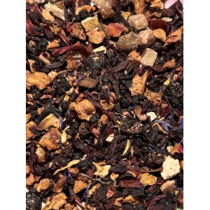 Hibiscus, morceaux de pommes, baie de sureau (19%), groseilles (11%),écorces d'oranges, écorces d'églantier, pétales de rose, morceaux de pêches, morceaux d'ananas, fleurs de tournesol, cassis (1%), fleurs de bleuets, framboise (0.5%), morceaux de fraise(0.5%), myrtilles (0,2%). Peut contenir des traces de fruits a coques, lait et de soja.